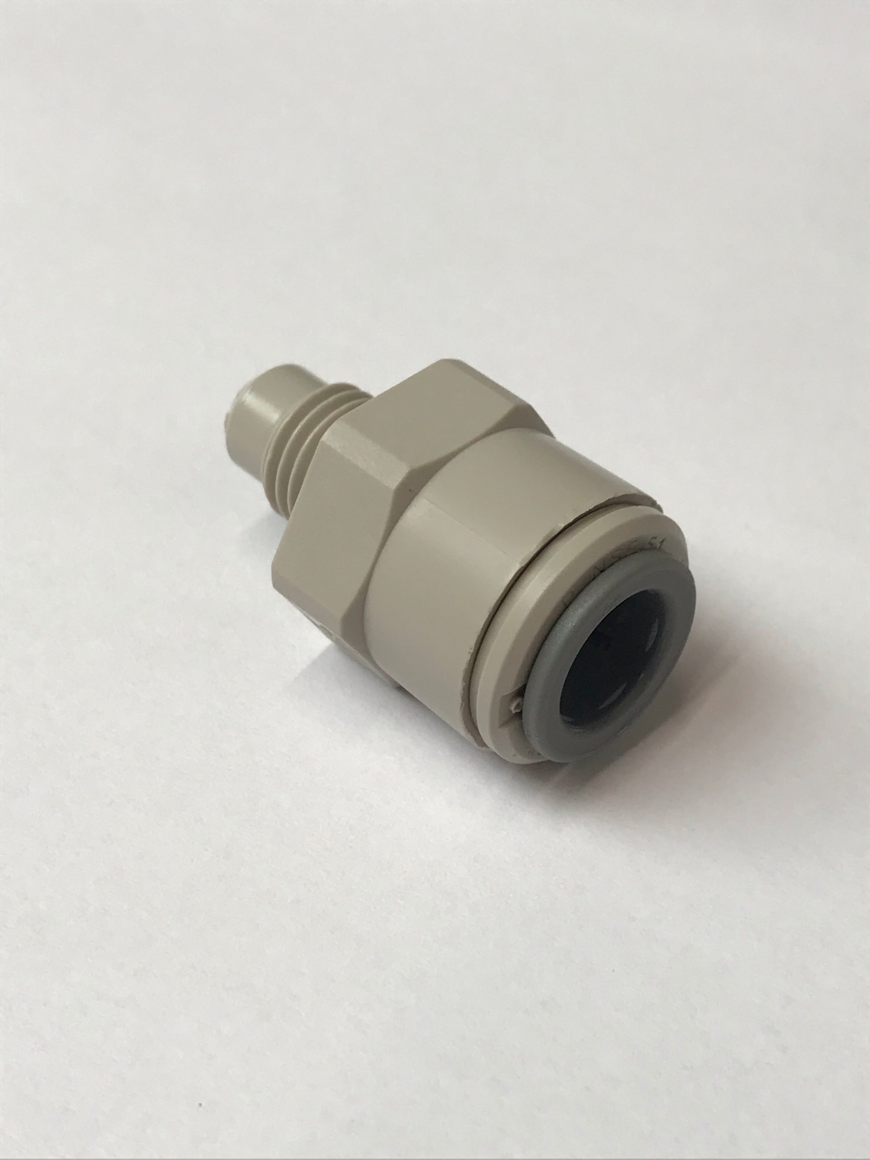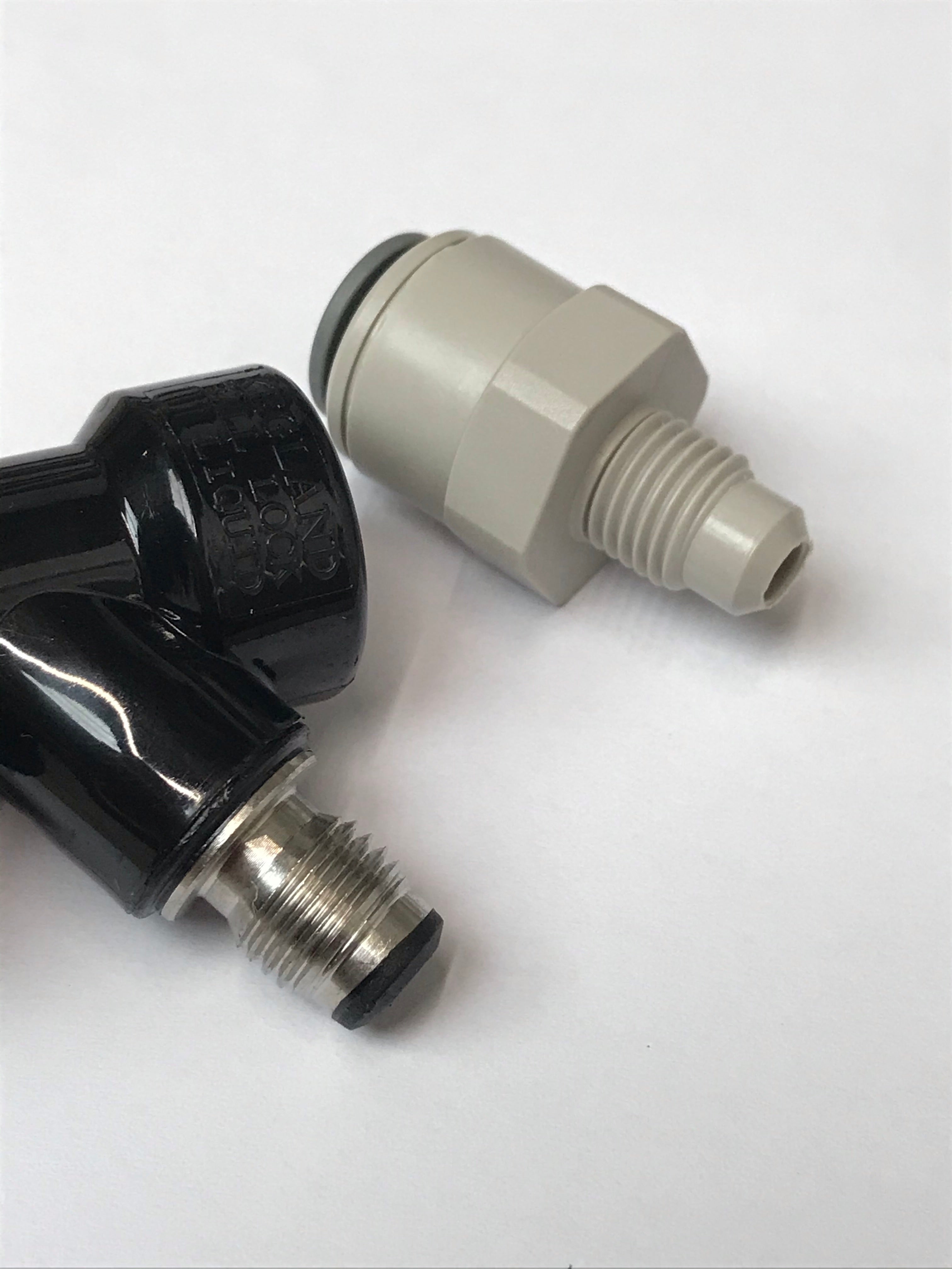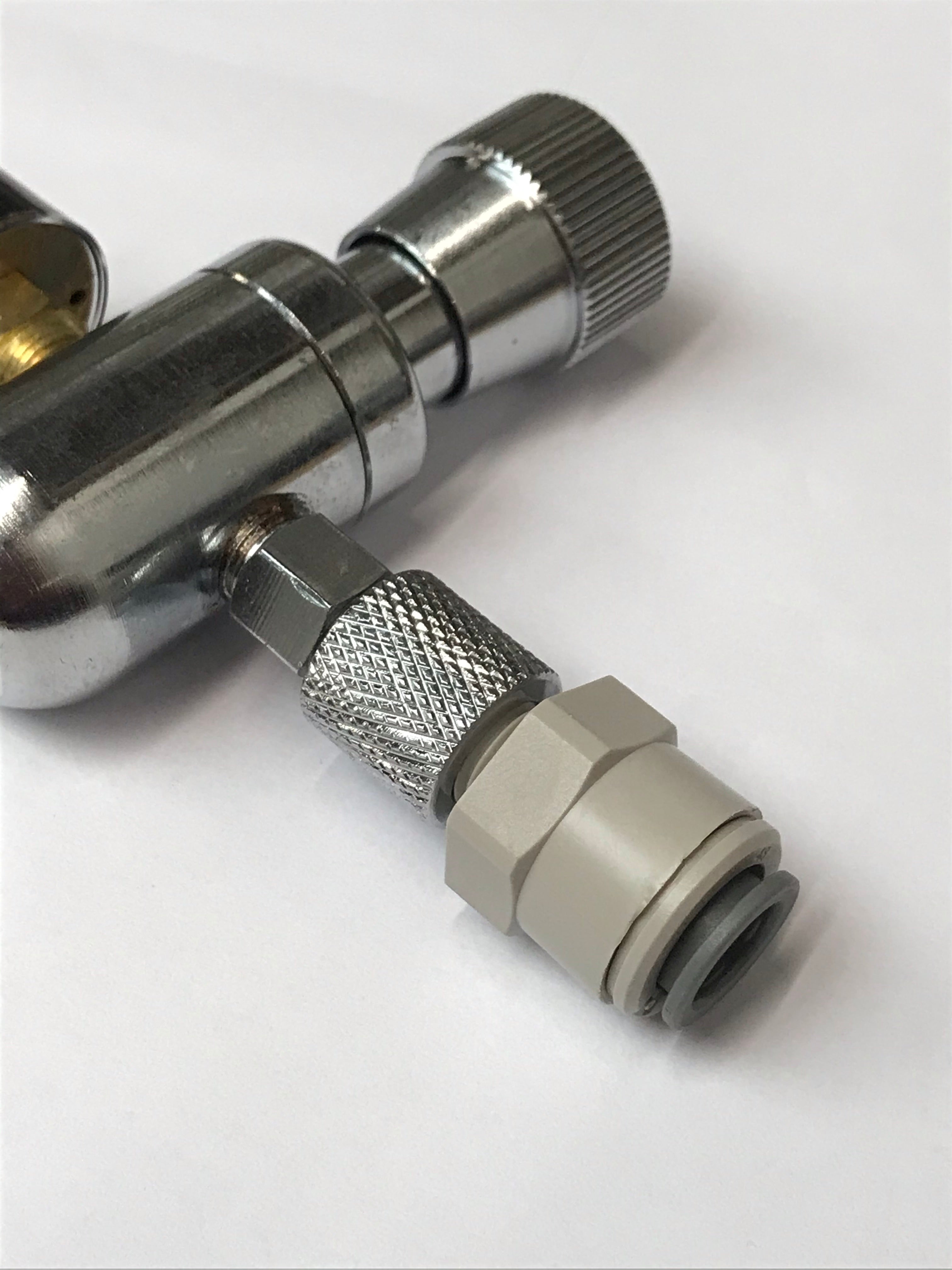 This fitting is the same as a corny keg disconnect so it can be used to link a regulator with only 1/4” FFL output to a 3/8” gas line (as shown in photo).