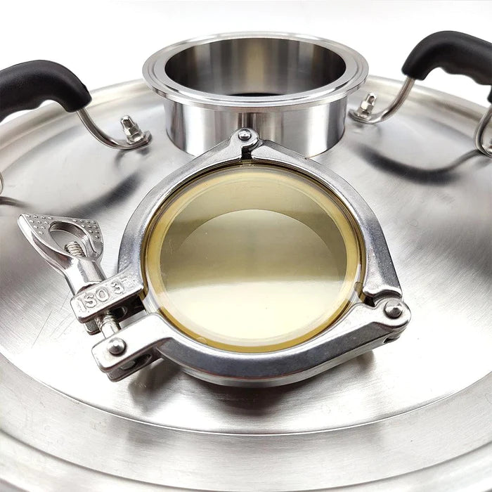 Designed to be extremely sturdy when using heavier stills or off-center steam condenser units. Now you can watch your wash boil and see if it's foaming or about to puke. If you are brewing beer indoors you may want to use a steam condenser lid set, without having to take off the entire lid to do hop/salt additions, simply remove the 3" Sight Glass and throw in (take care when hot).