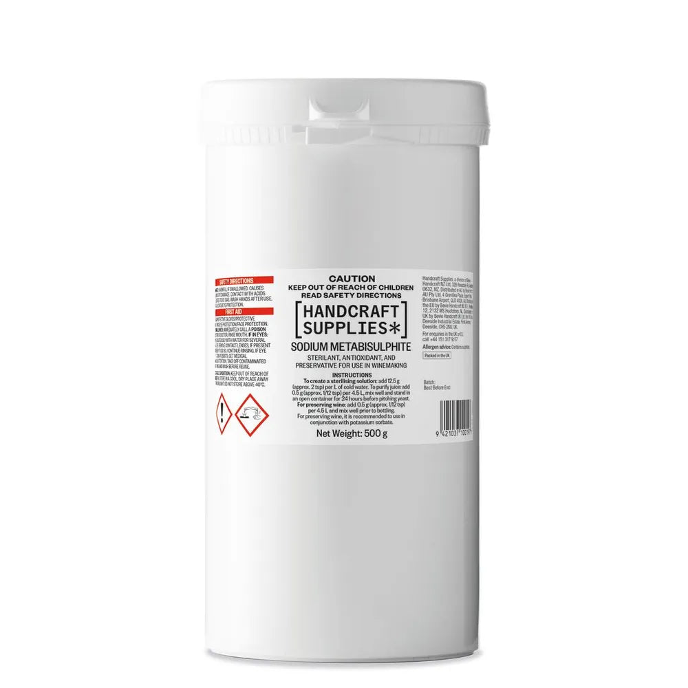 Handcraft Supplies Sodium Metabisulphite can be used in winemaking to create a sterilising solution, to purify juice, or to preserve wine.