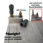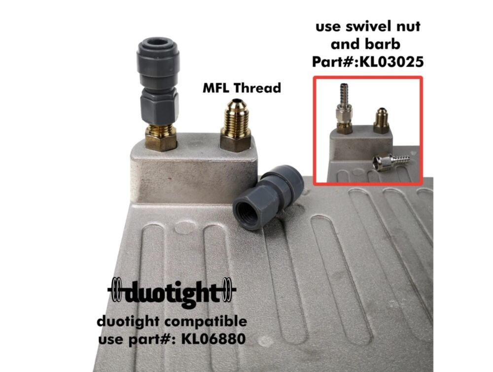 The inlets and outlets on the cold plate are the standard mfl threads so they are compatible with the wide range of other fittings that we sell such as swivel nut and barbs or the duotight fittings