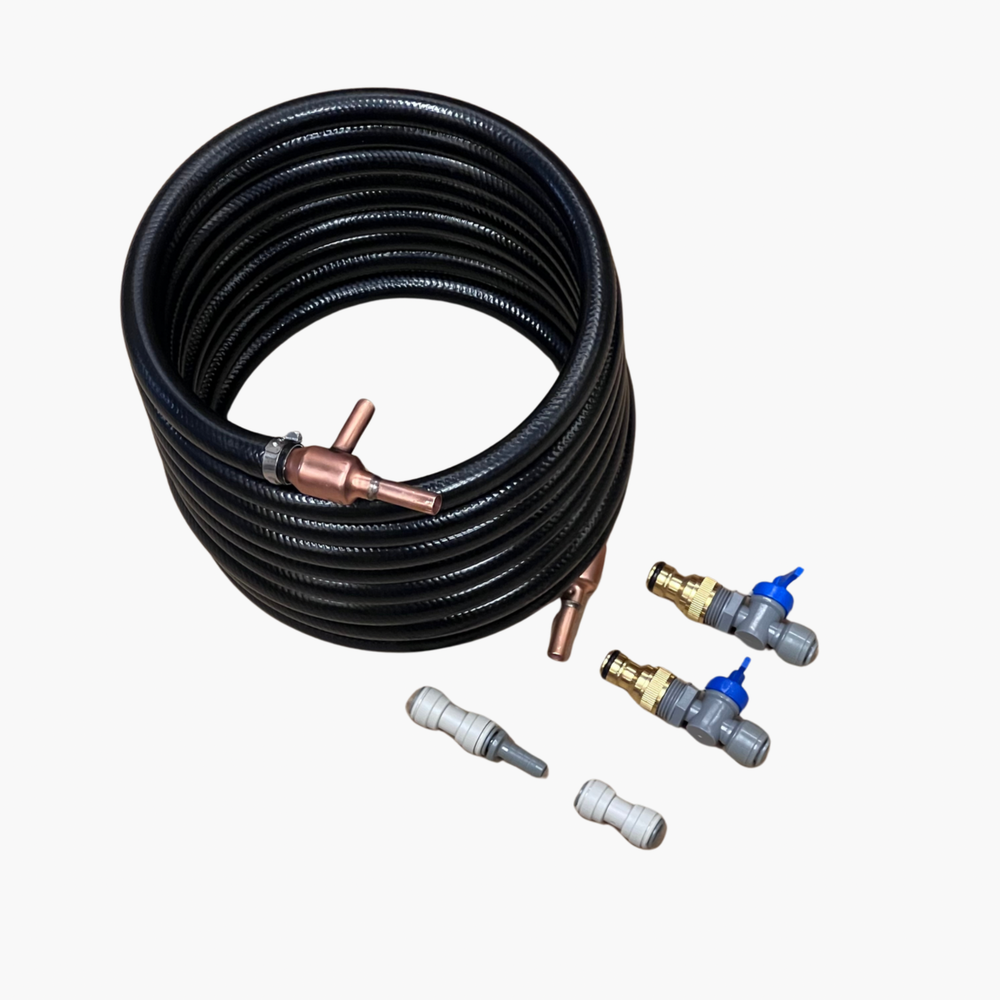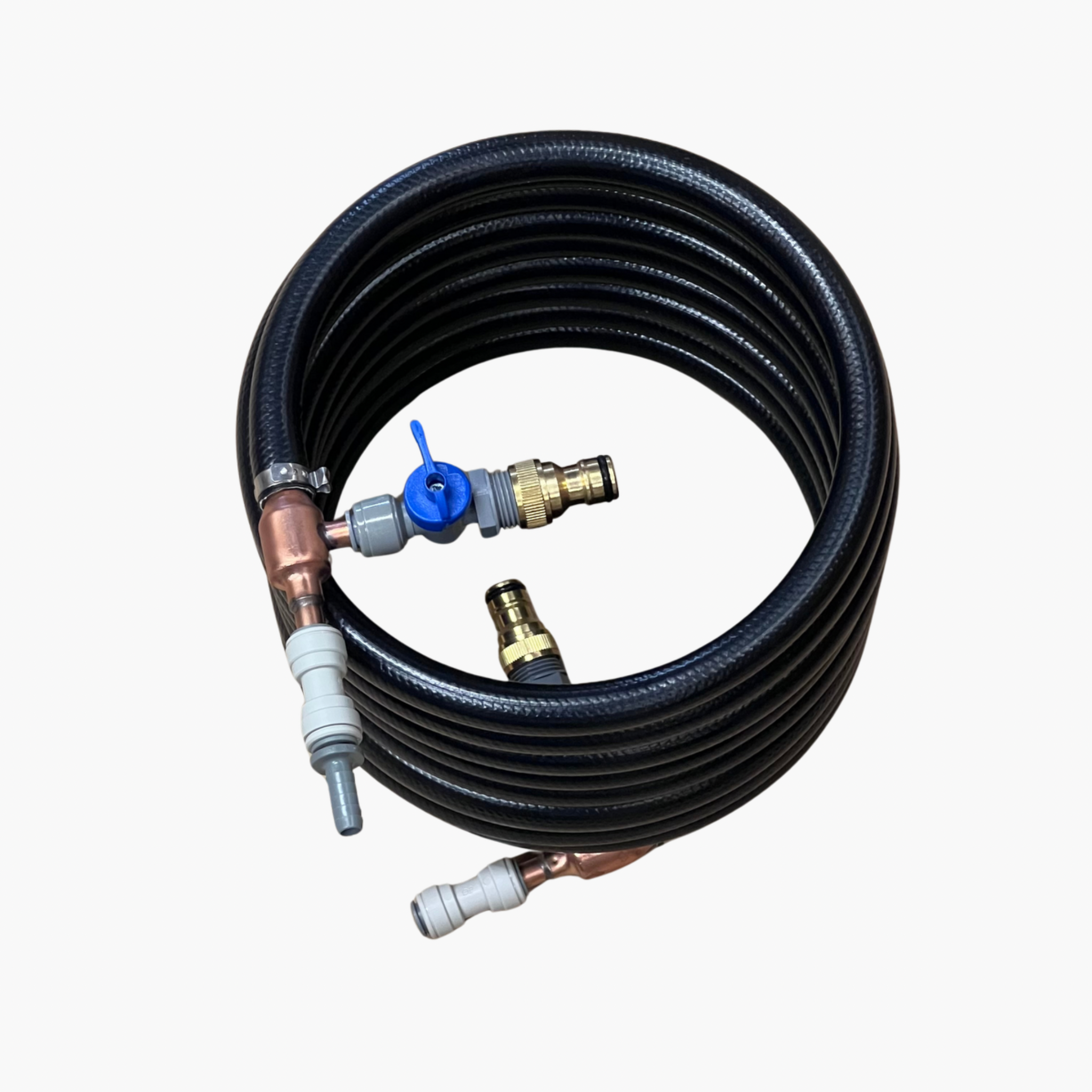 PLEASE NOTE: these inexpensive counterflow chillers have a pliable polymer outer shroud. Because if this, they should not be exposed to restricted unregulated mains water pressures which can easily reach ~100psi when the flow is restricted. Warranty does not cover bursts/ruptures/blowouts of this outer layer resultant from having a kink in your output hose, restricting attachments on the output (such as sprinklers) or similar. Always ensure the output hose is free from any pressure buildup when using unregulated mains water. If you are looking for a more heavy duty, pressure resistant counterflow chiller, we urge you to consider the Coolossus Counterflow Chiller