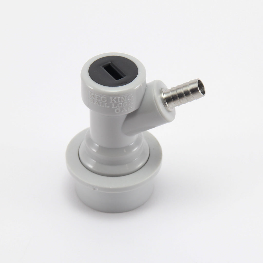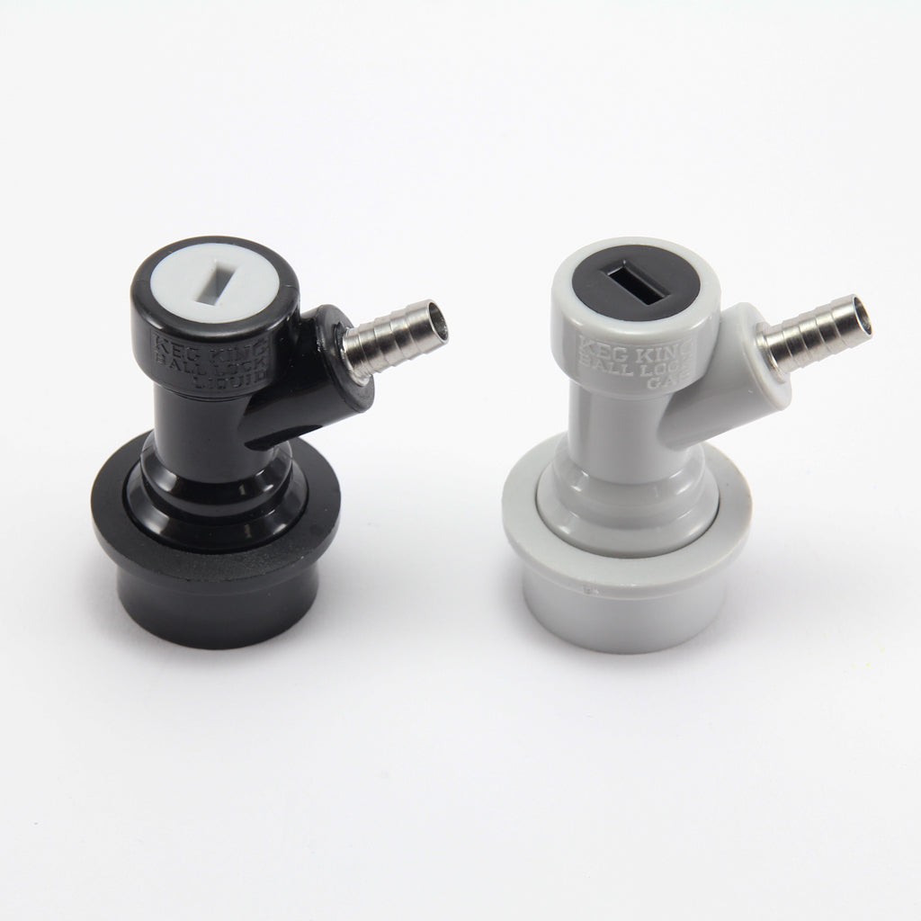 Keg king branded beer out and gas in ball lock disconnects with barb fitting. Barb will fit standard 3/8 OD line (1/4 ID)