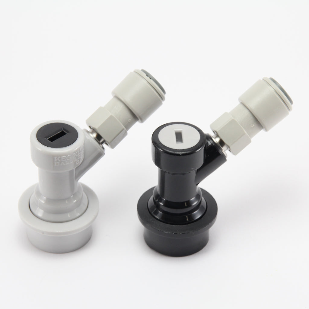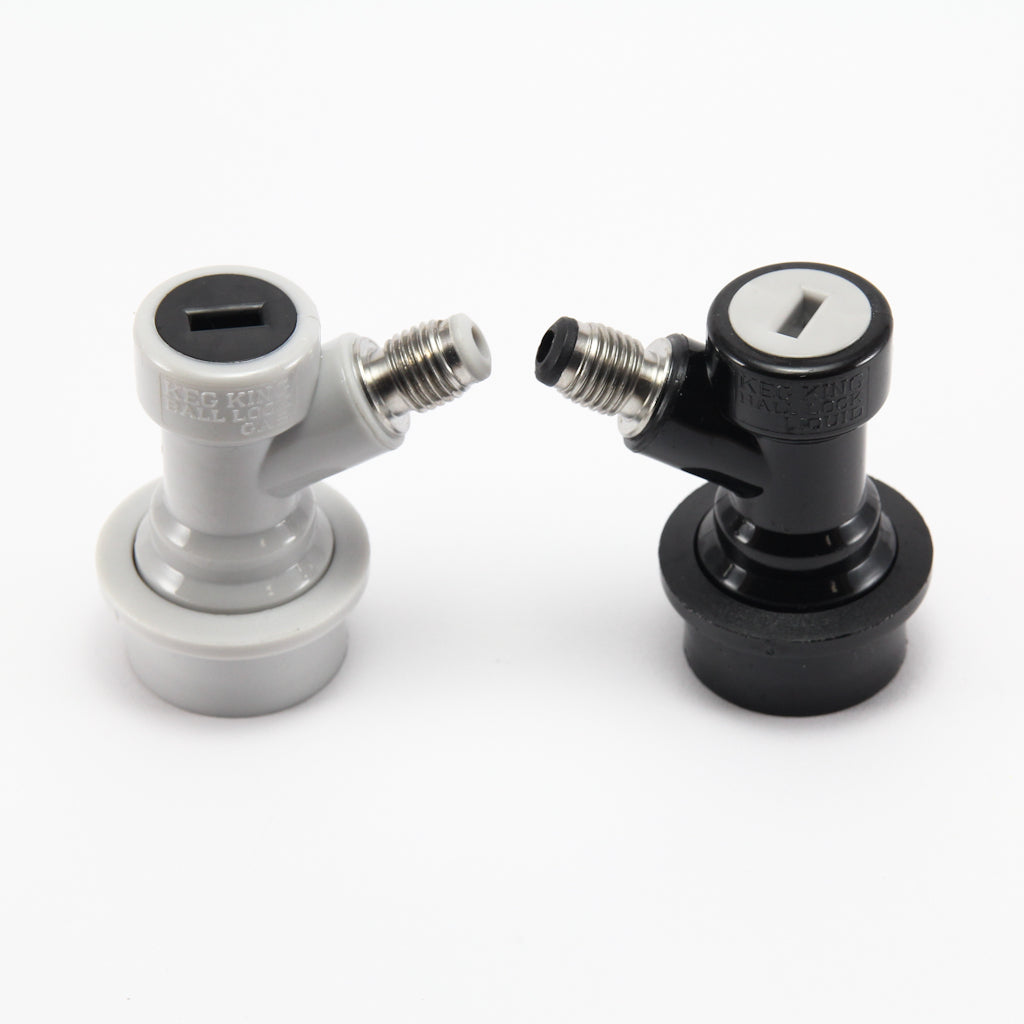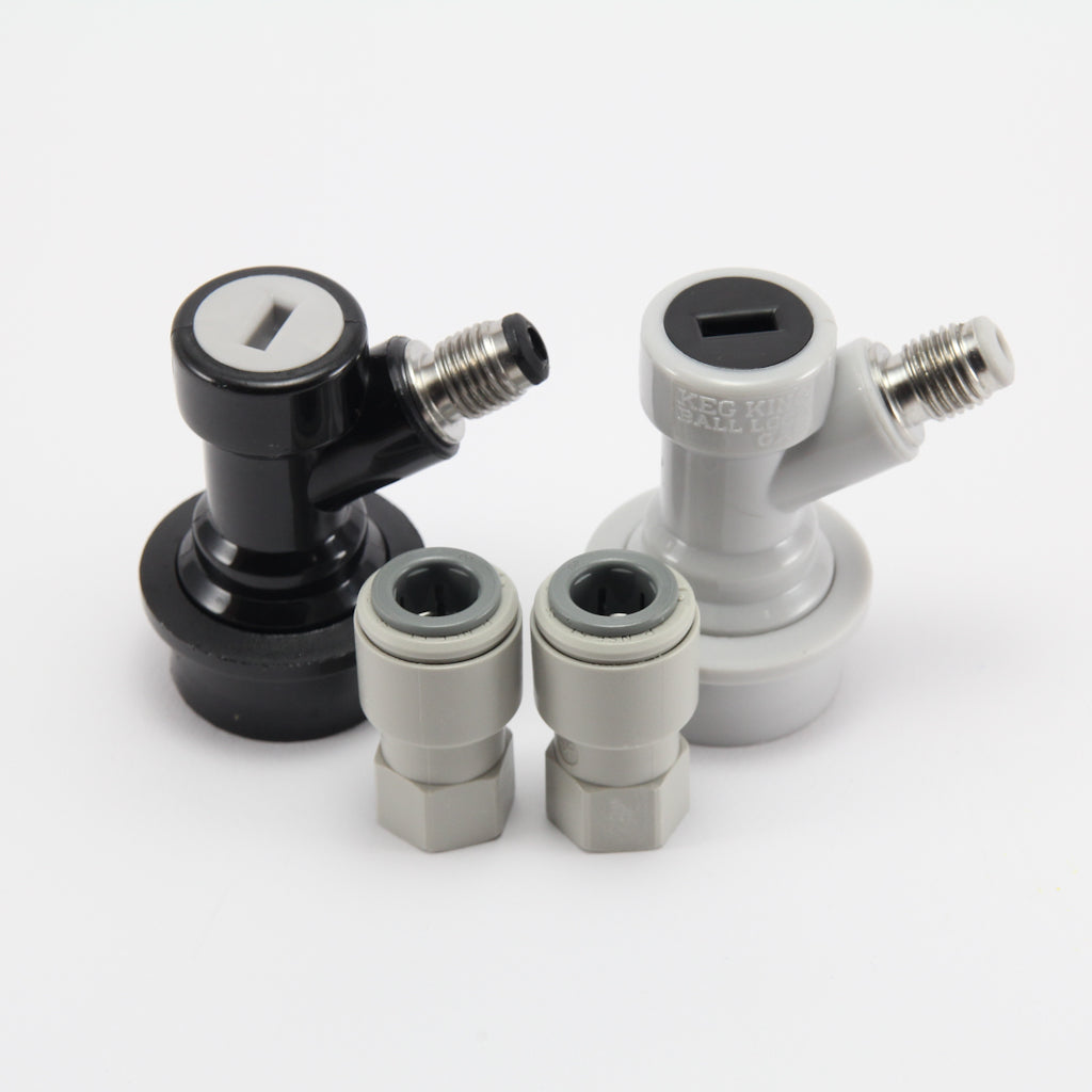 Keg king branded beer out and gas in ball lock disconnects with MFL fitting. John guest fittings can be screwed onto the MFL fitting to enable push fit connections with your beer line / gas line. This is easy to use and secure.