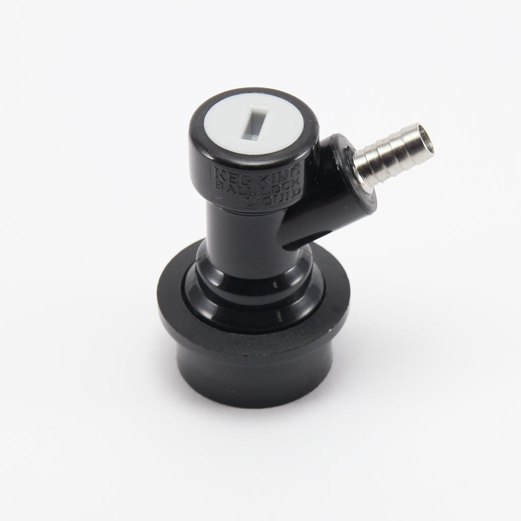 Keg king branded beer out ball lock disconnect with barb fitting. Barb will fit standard 3/8 OD line (1/4 ID)