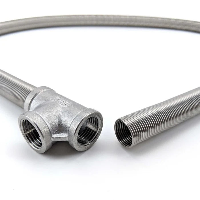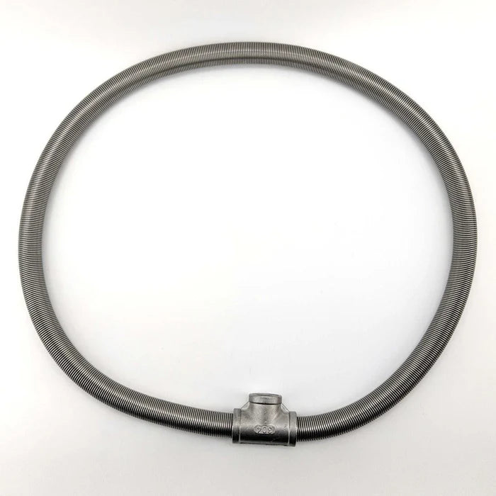 The helix attaches to the brewery system’s ball valve with a half inch stainless steel T-piece where it will thread directly into the female threading of the fittings. The helix will work to filter trub and particulate matter from the kettle while also helping to pick up wort from just underneath the ball valve opening.